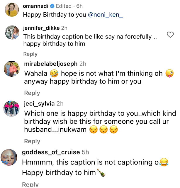 Sunday, June 9, 2024 -IG users have tackled actress Oma Nnadi, over her birthday post to her husband, Nonso Enem, as he turns a year older today, June 9.